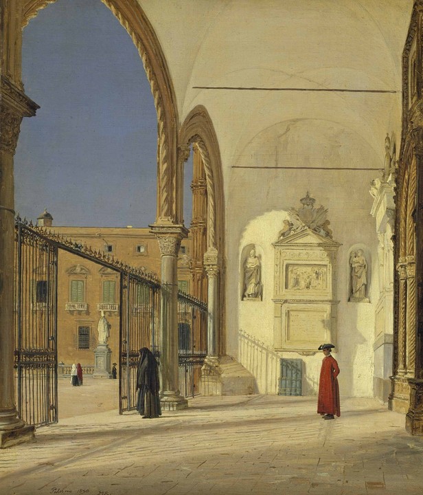 Kunstnerens dødsboauktion 1849, nr. 47 (”Forhallen til Metropolitankirken i Palermo. (madre chiese)”); købt her af Heinrich Lorenz Frølich; dennes auktion, 22. juni 1874, nr. 7; købt her af H. Hagen på vegne af Heinrich Hirschsprung.