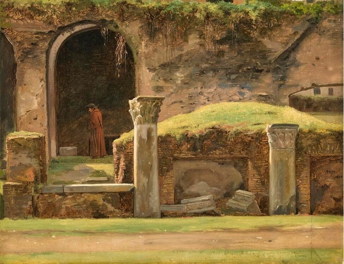 Kunstnerens dødsboauktion 1849, nr. 21 (”Parti af Coliseet i Rom”); købt her af F.C. Krohn; dennes auktion, 12. november 1883, nr. 33 (”En gang i Coliseo”); købt her af grosserer Christian Hornemann; dennes auktion, 16. december 1884, nr. 81; købt her af kammerherre, hofjægermester P. Collet (1905); dennes slægt; Bruun Rasmussen auktion 929, 30. oktober 2025, nr. 354 (afb., ikke solgt).